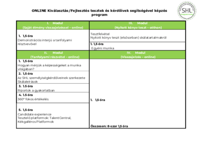 A tanfolyam négy másfél órás modulból áll, melyek szintén előre egyeztetett időpontokban végezhetők el. E modulokra akár többen is tudnak egyidejűleg jelentkezni. A megbeszélések után a résztvevőknek elküldjük a prezentációkat. A cél az, hogy felkészüljünk az első vizsgálat lebonyolítására. A vizsgálati személyeket általában az SHL Hungary Kft. biztosítja, de arra is lehetőség van, hogy a résztvevő a saját cégéből jelöljön ki vizsgálati személyt.