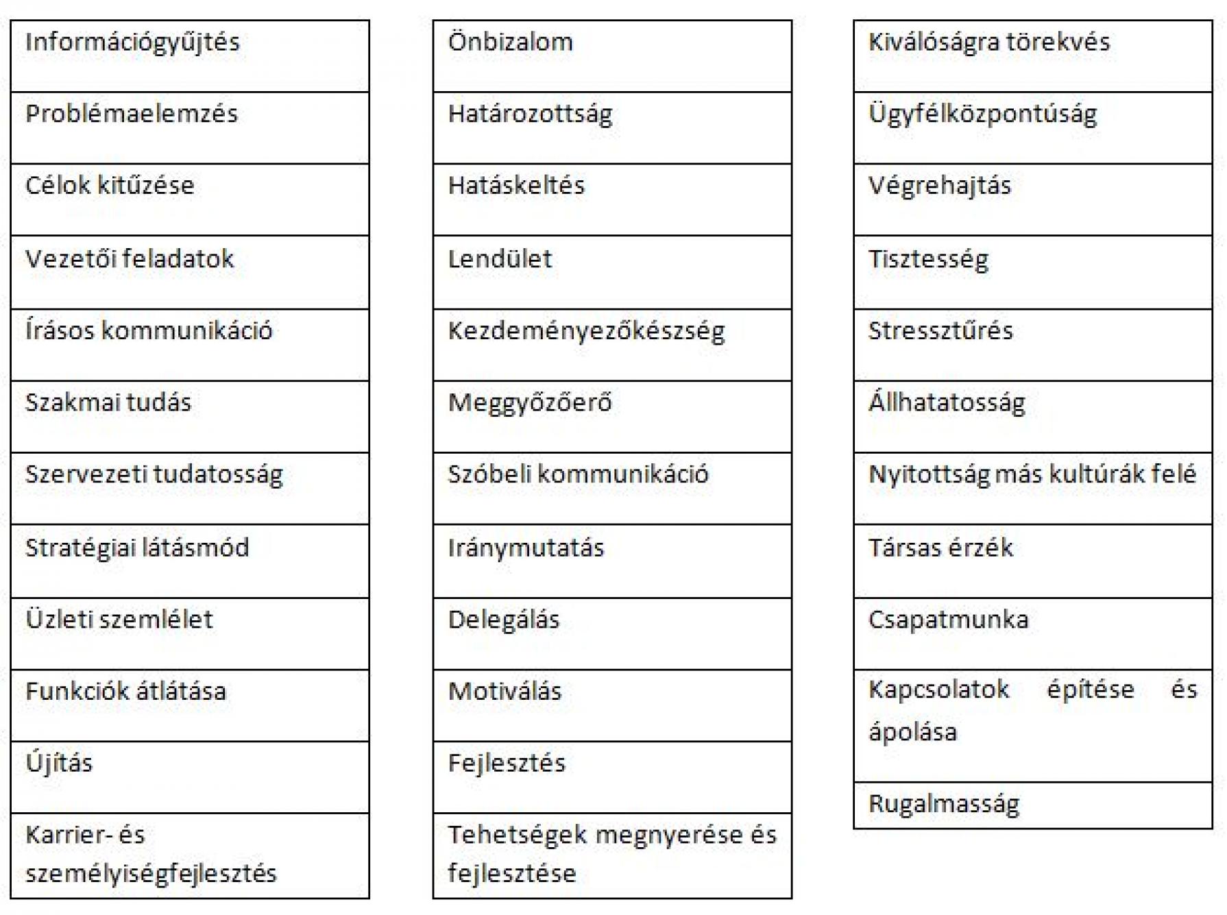 36 kulcsfontosságú vezetői kompetenciát vizsgál, több nézőpontból elemezve azokat.