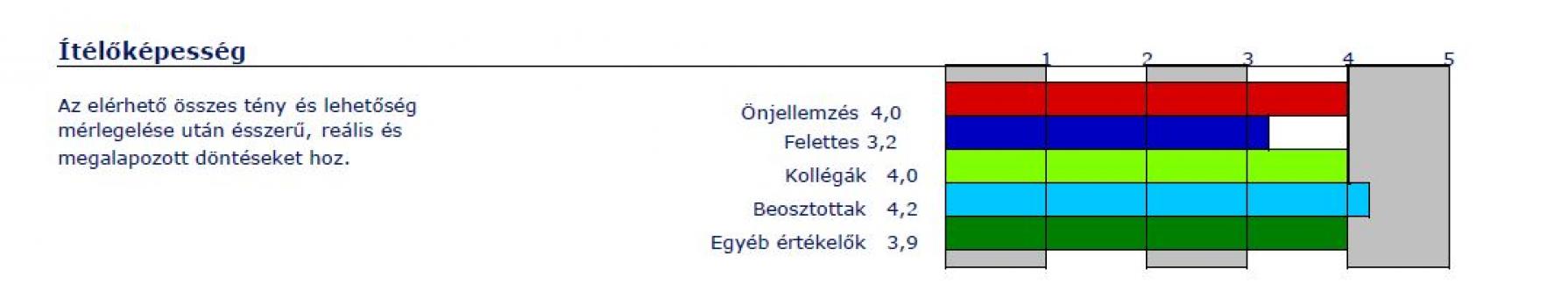 A fenti képről az Ítélőképesség kompetenciájának értékelői csoportok által adott pontszáma és egymáshoz való viszonya is könnyen leolvasható, egyértelművé téve, mit gondolnak felettesei, kollégái és beosztottjai a vizsgált személy bizonyos kompetenciáiról. Ezen kívül az önjellemzésből kapott pontszám és az egyéb értékelői kategóriába besorolható más forrásból szerzett értékelések is láthatóak.
